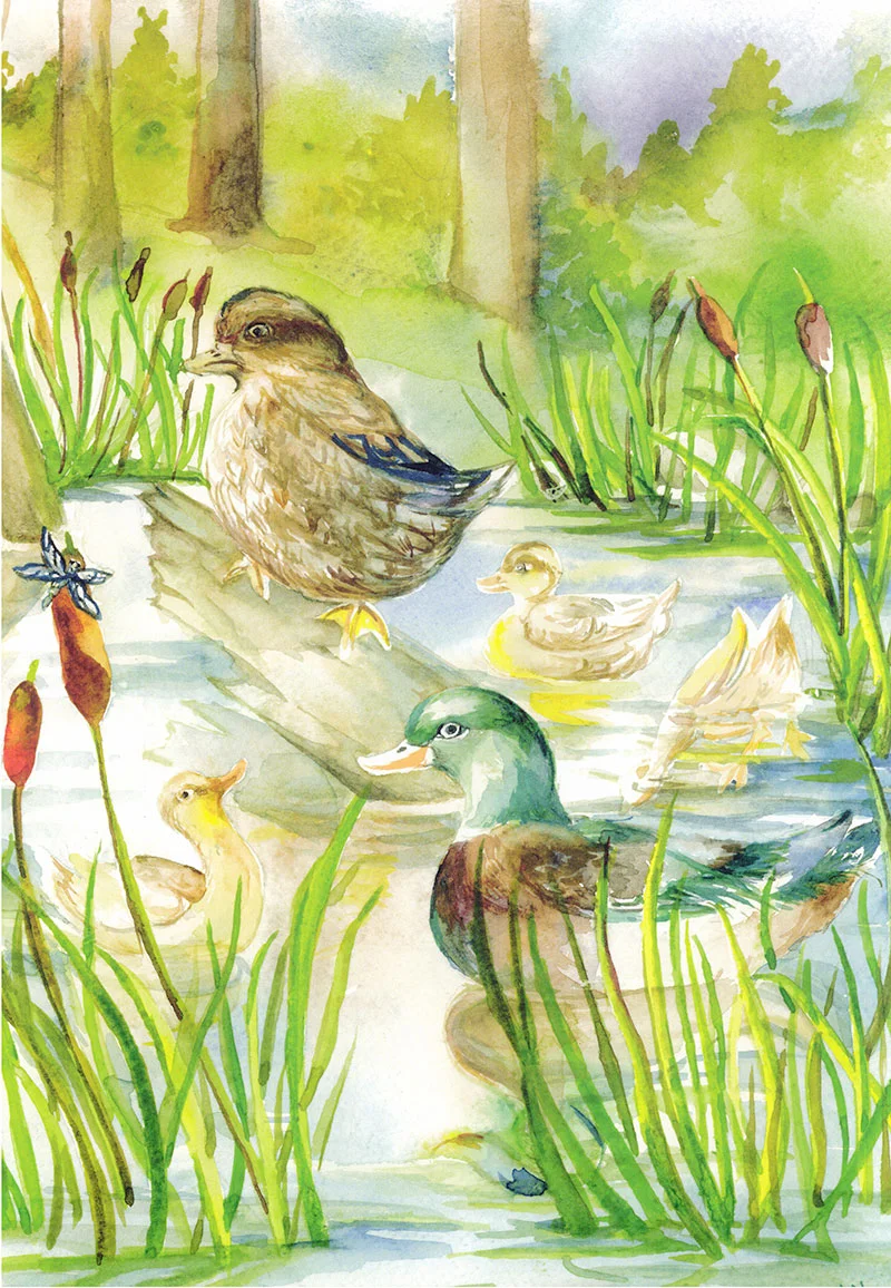 “We did it!” they yelled, pushing their treasure ashore. Helga Duck waddled ahead to her nest to find John. After all, her mate’s strength was needed to carry the book. While some duck built their nests in the hollows of dead trees, John and Helga’s home was comfortably situated in a hole in the ground. The bottom was carpeted in the softest feathers from Helga’s chest. The whole nest was encircled with reeds, ferns, willows and a large rock.